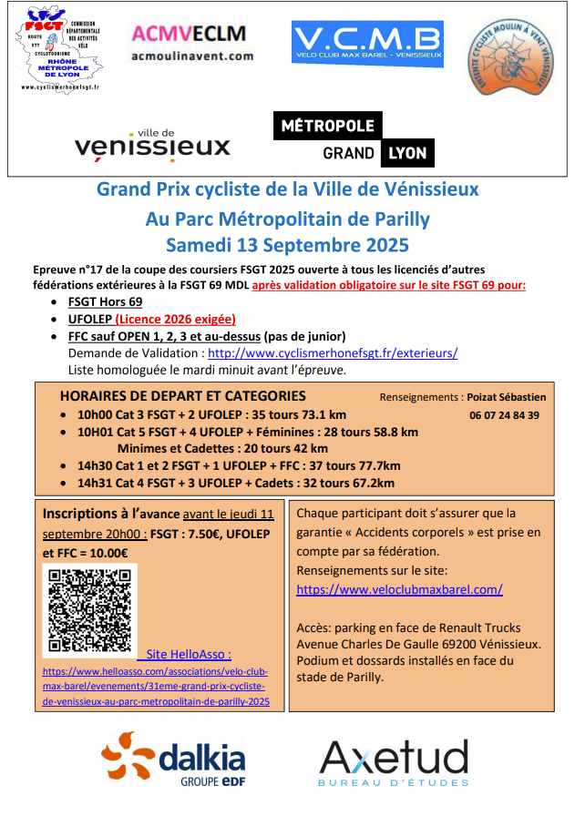 Les inscriptions au Grand Prix de Parilly se font UNIQUEMENT via le site internet HelloAsso en cliquant sur le lien ci-dessous (et au plus tard avant le JEUDI 11 SEPTEMBRE à 23h59). AUCUNE INSCRIPTION ne sera prise sur place.