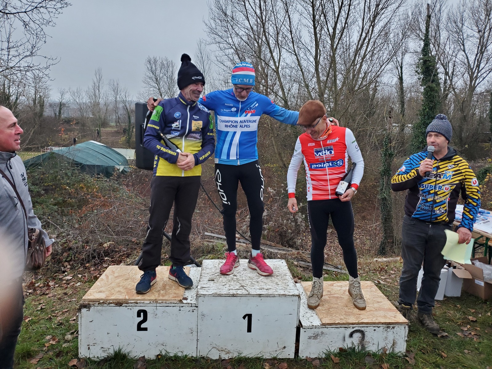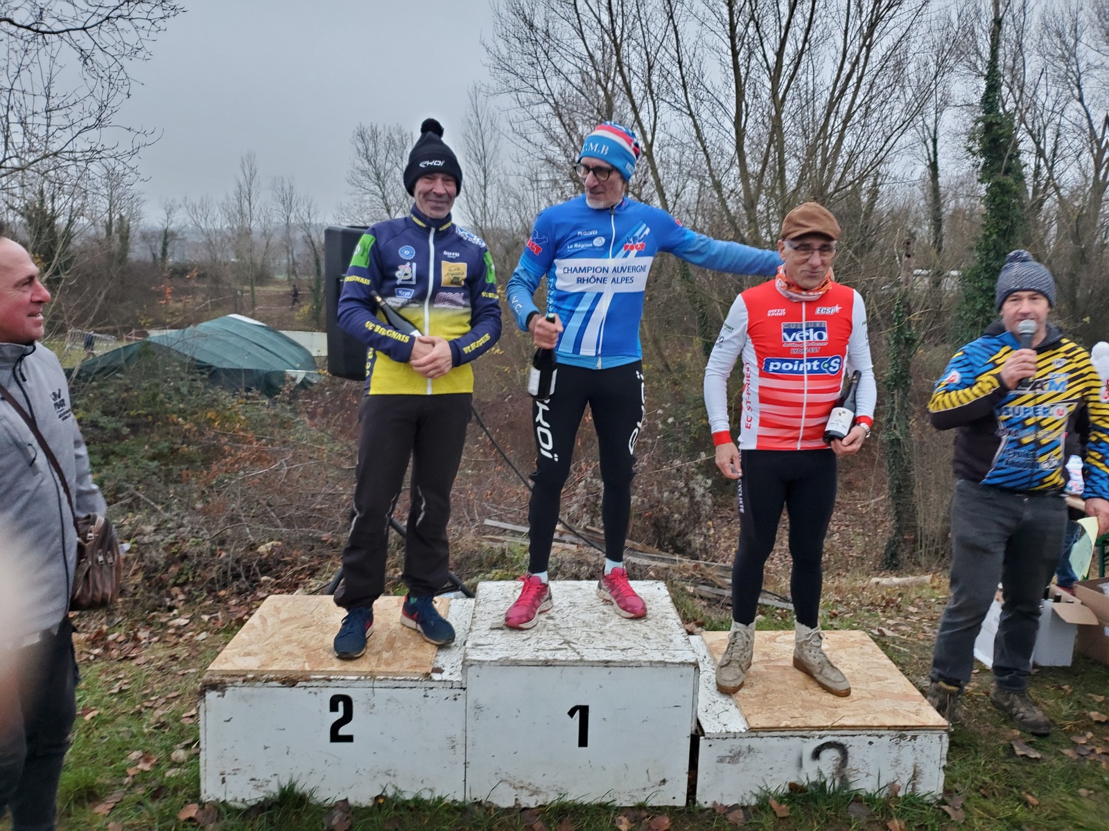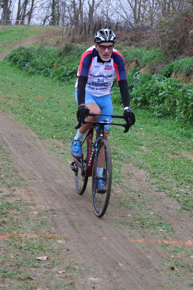 Serge Plasse prend son deuxième titre consécutif de champion Cyclo-Cross AURA catégorie super ancien et je termine difficilement ce circuit technique et physique. Bravo Serge c'est une excellente performance obtenue à 'issue d'une course maîtrisée.
