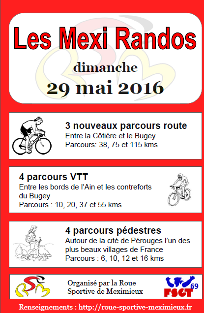 Plus d'informations: http://roue-sportive-meximieux.fr/calendrier-des-%C3%A9v%C3%A9nements/rallyes-meximieux-route-vtt-p%C3%A9destre