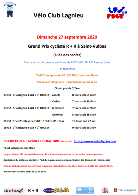INSCRIPTION A L’AVANCE OBLIGATOIRE sur le site : https://www.veloclublagnieu.com