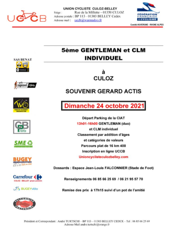Pour plus d'information et inscription: http://unioncyclisteculozbelley.com/2021/09/dimanche-29-octobre-1er-gentleman-de-culoz-clm-a-2-ou-seul-avec-la-presence-des-coureurs-professionnels-maxime-bouet-et-ses-amis/