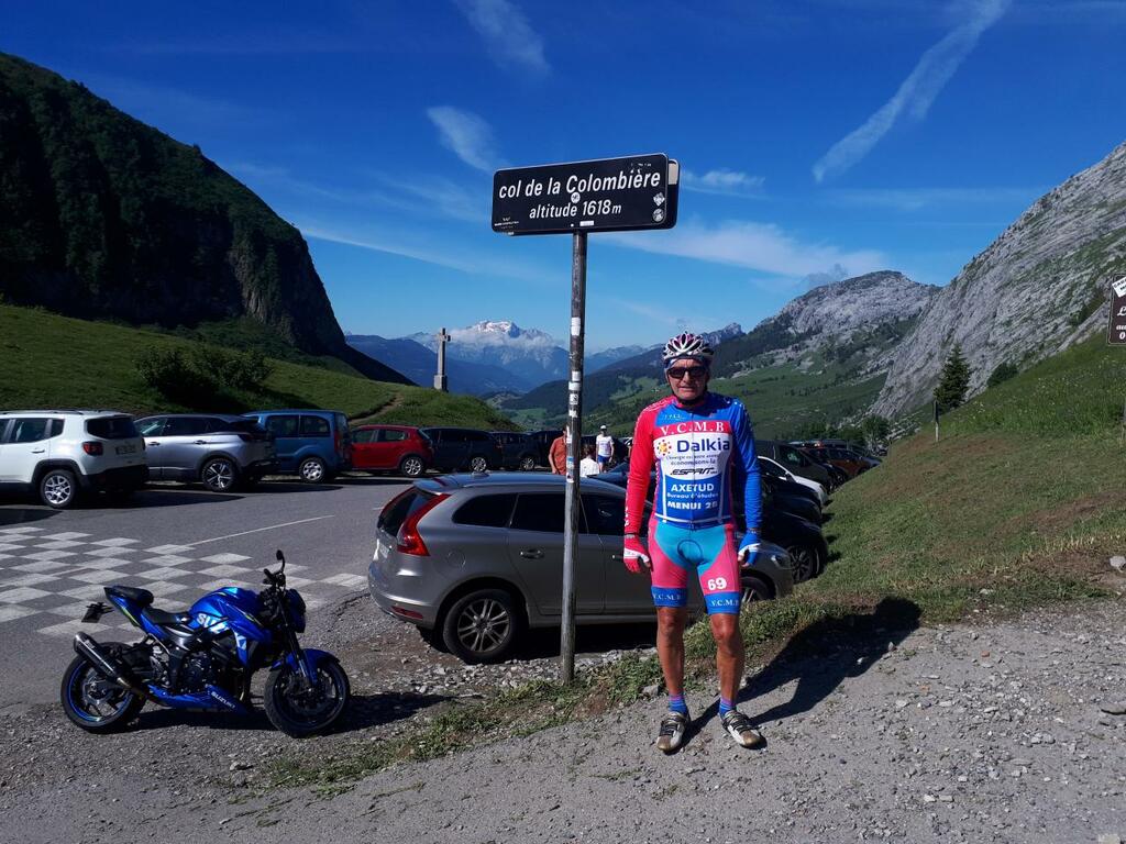 C'est notre trésorier, Alain qui a passé en tête au col de la Colombière, avant le tour de France..... sous un beau ciel bleu