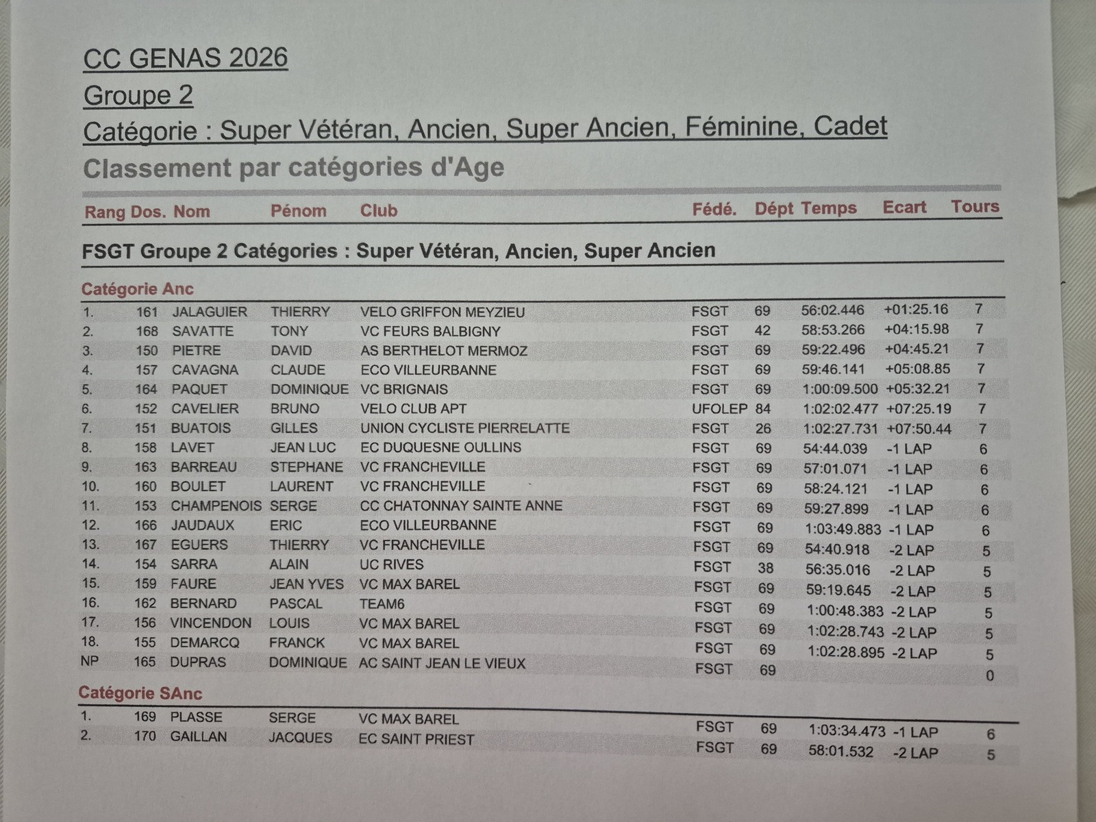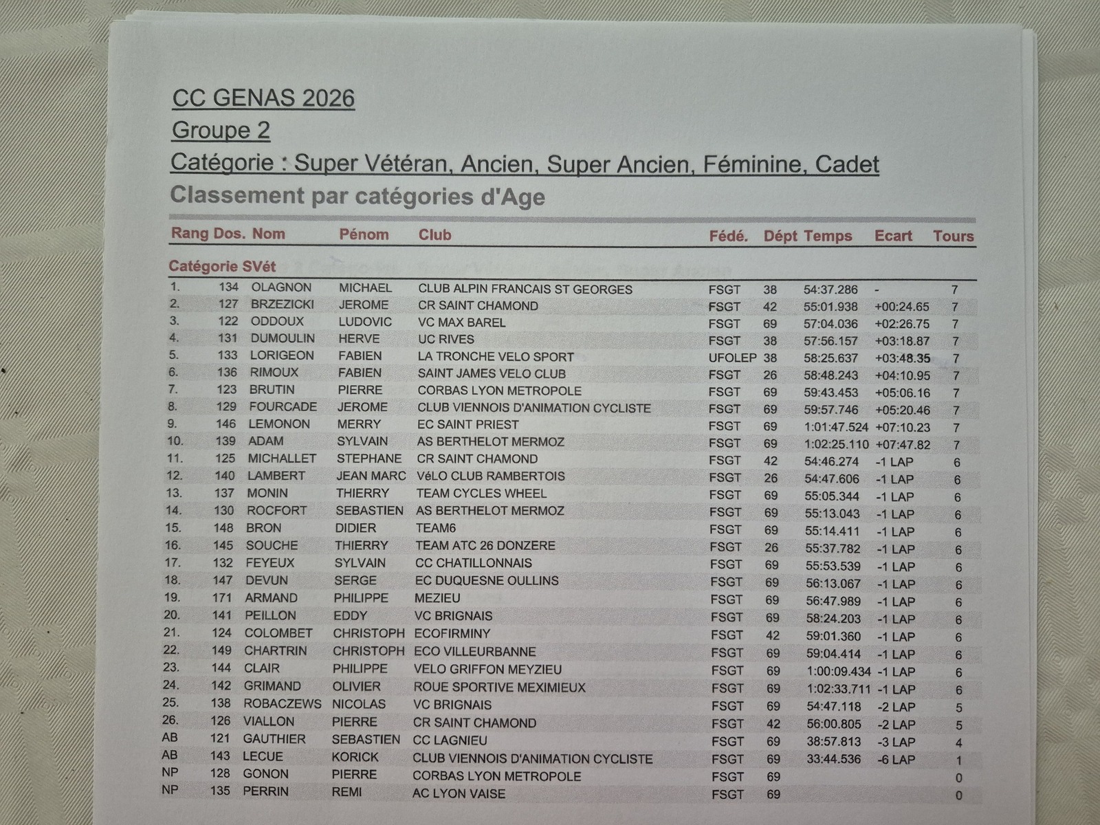 Cyclo-cross de reprise saison 25/26 organisé de belle manière au fort de Genas par l'ASBM. Météo agréable pour la course de notre groupe, avec la reprise de Ludovic Oddoux, Franck Demarcq, Serge Plasse, Louis Vincendon et moi-même. Ludo est 4ème du scratch 3ème des super vétérans, Serge premier des super anciens. Un excellent début de saison !