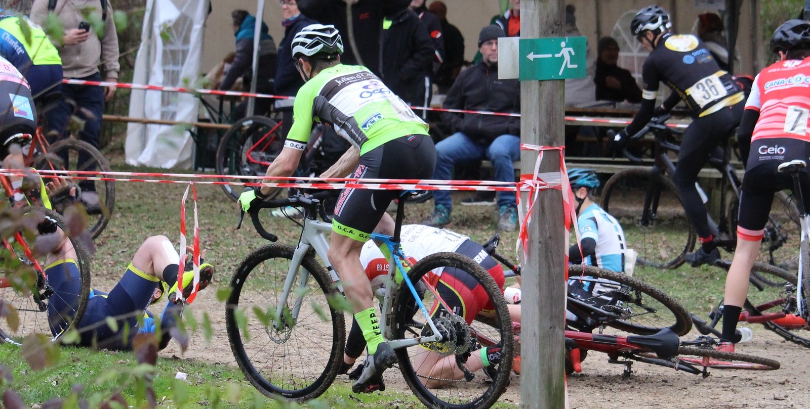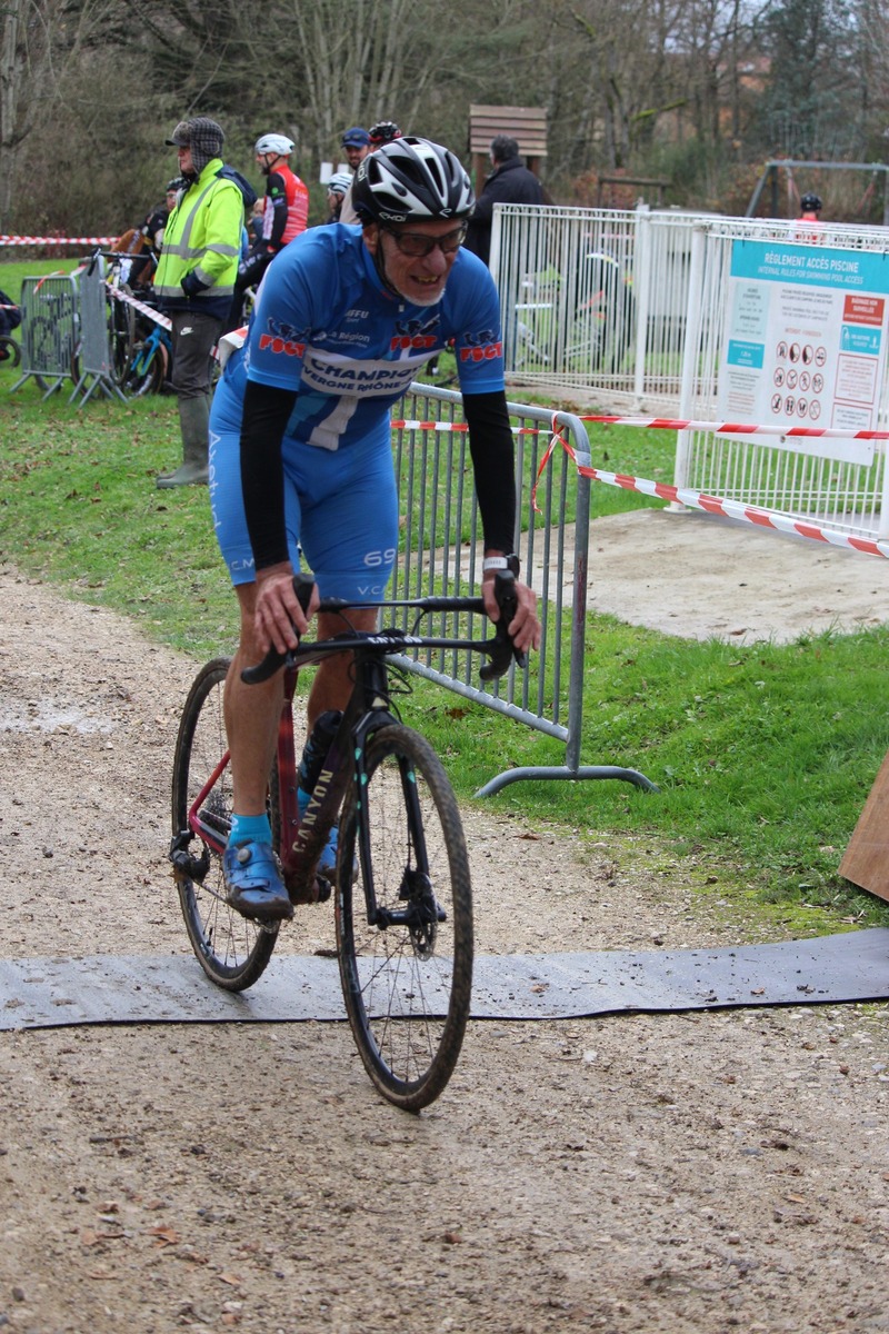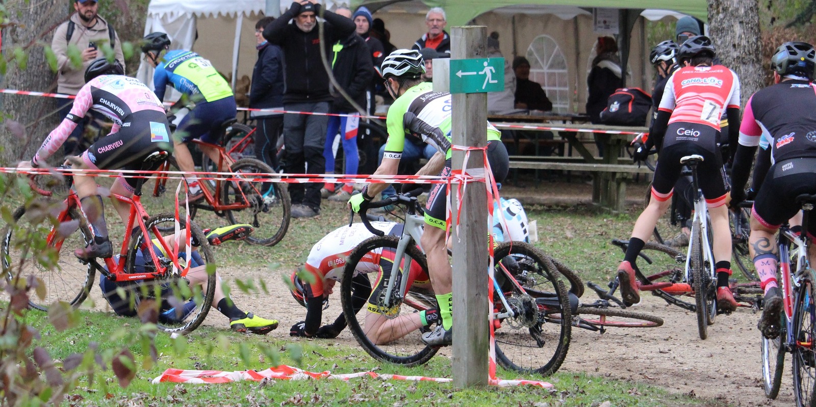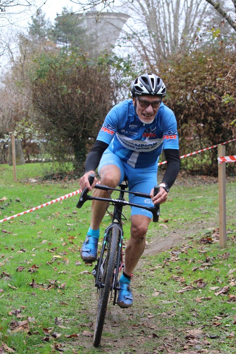 Serge Plasse en reprise prudente sur ce CX tracé dans le camping des oiseaux de Villars Les Dombes. Des virages serrés, des banderoles dans tous les sens pour évoluer autour des tentes du camping. Une météo agréable et un circuit mouillé et boueux par endroit. A l'arrivée Serge assure le podium et prend des points précieux pour le challenge des cyclocross, je termine avec deux chutes sans gravité.